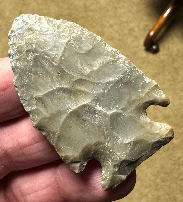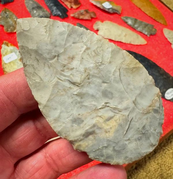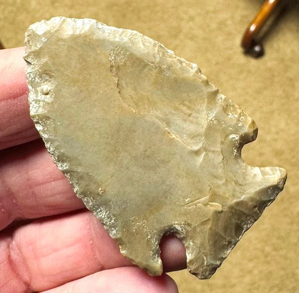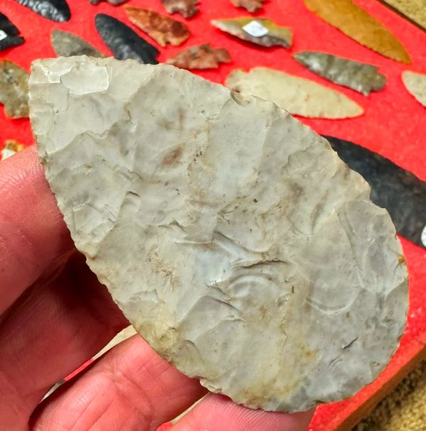 2-7/16" Hornstone Thebes, Found in Hendricks Co. IN. near Pecksburg along W. County Road 650 S. Ex- McLain. A name that could be associated with the piece which was written on the box was "Daum's". Heavy white patina on this piece. $95