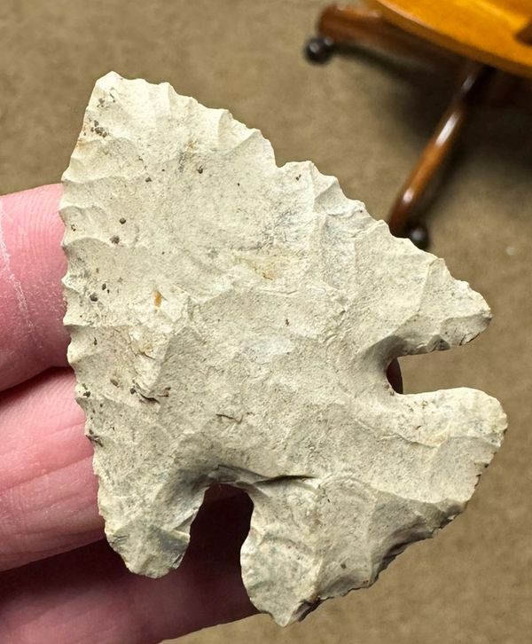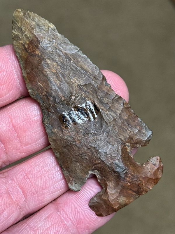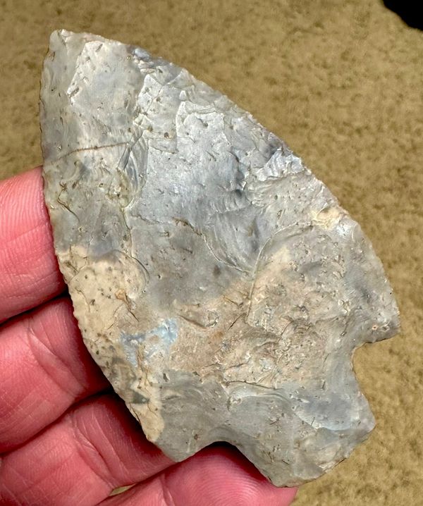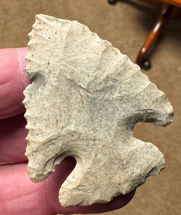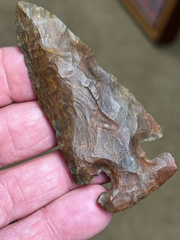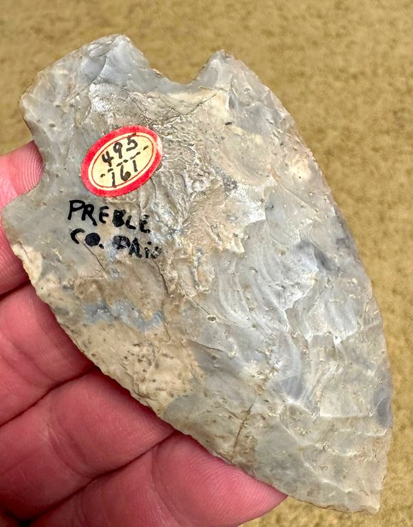 3-1/4" Stripped Upper Mercer E-Notch Thebes, Found in Hamilton Co. OH. Ex- Lee Keller. Nice colors to this E-notch that has heavy patina, Large for the type as well. $800