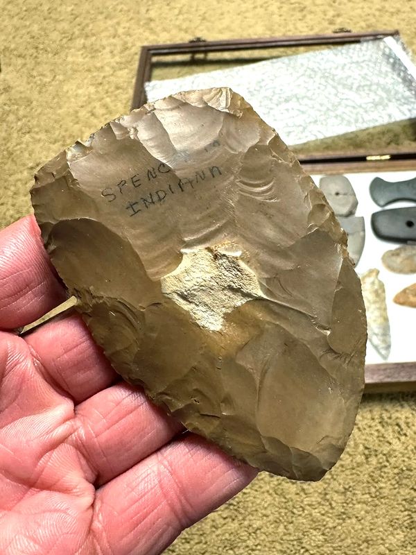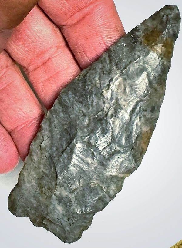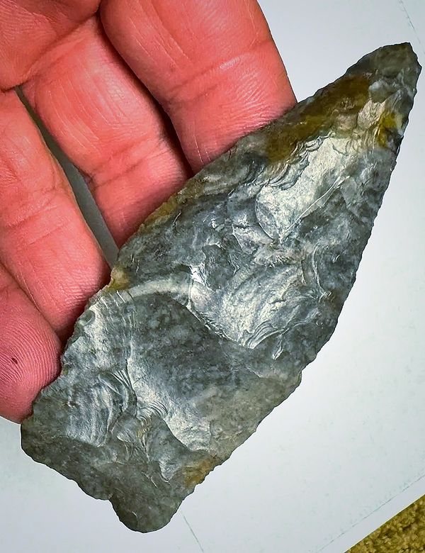 4-1/8"Hornstone Blade, Found in Spencer Co. IN. Ex- Elaine Holzapfel. Highly patinaed hornstone, well made and thin. Not part of the Gerber Cache. $225