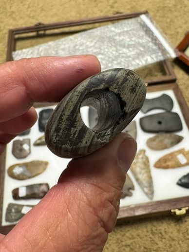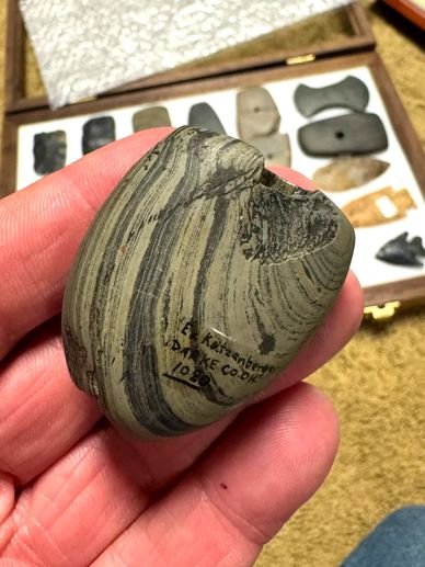 2" Banded Slate Bannerstone, Found in Darke Co. OH. Ex- Katzenberger Collection, Ex- Elaine Holzapfel. Pictured in Archaeology of Darke Co. Ohio. Great old time collector history. $550